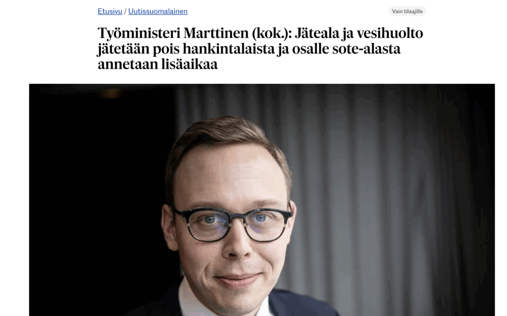 - Keskisuomalainen: Työministeri Marttinen (kok.): Jäteala ja vesihuolto jätetään pois hankintalaista ja osalle sote-alasta annetaan lisäaikaa