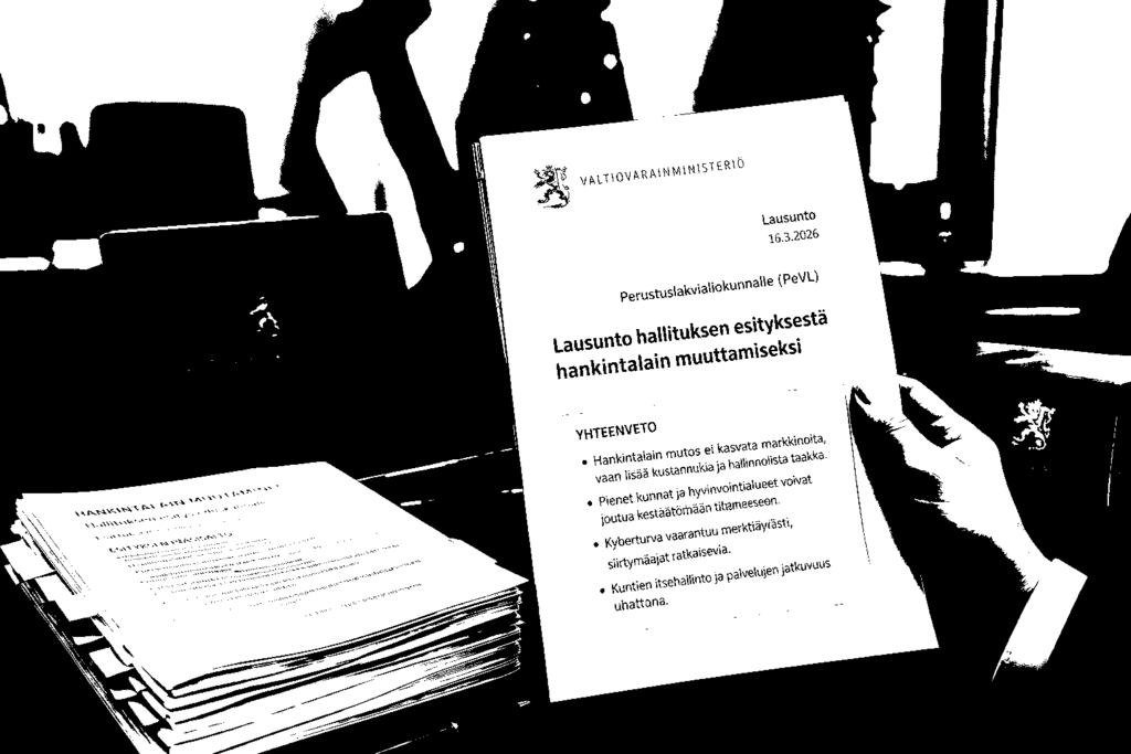 Valtiovarainministeriö (VM) varoittaa, että hankintalain muutos ei lisää kilpailua eikä markkinaehtoista palvelutuotantoa, vaan kasvattaa kustannuksia, hallinnollista taakkaa ja riskejä erityisesti pienissä kunnissa. VM on erityisen huolissaan lakimuutoksen aiheuttamasta kyberturvavaarasta ja kansallisen tietoteknologisen suvereniteetin vaarantumisesta. Ministeriö esittää näkemyksensä eduskunnan perustuslakivaliokunnalle 16.3.2026 antamassaan harvinaisen suorasanaisessa lausunnossaan.