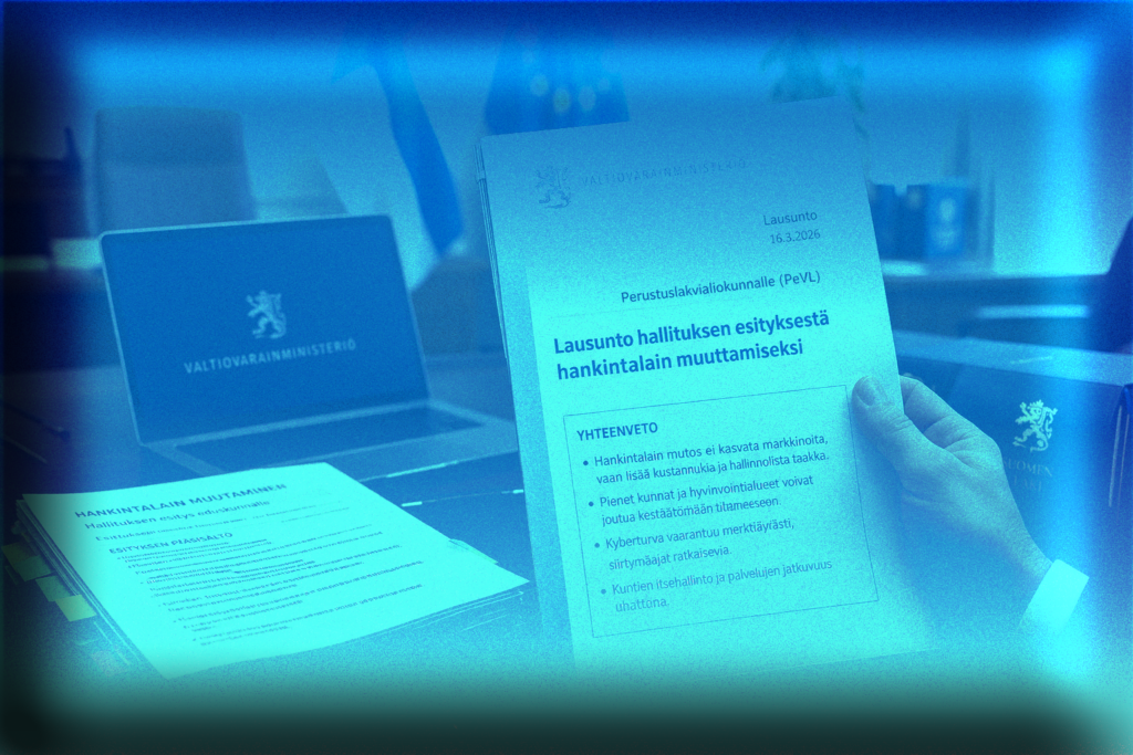 Valtiovarainministeriö varoittaa suoraan, että hallituksen esitys hankintalain muuttamiseksi voi lisätä kustannuksia, heikentää kyberturvaa, ajaa erityisesti pienet kunnat vaikeuksiin – eikä kasvata yksityisten yritysten hankintamarkkinoita. Ministeriö esittää huolensa eduskunnan perustuslakivaliokunnalle 16.3.2026 antamassaan lausunnossa.